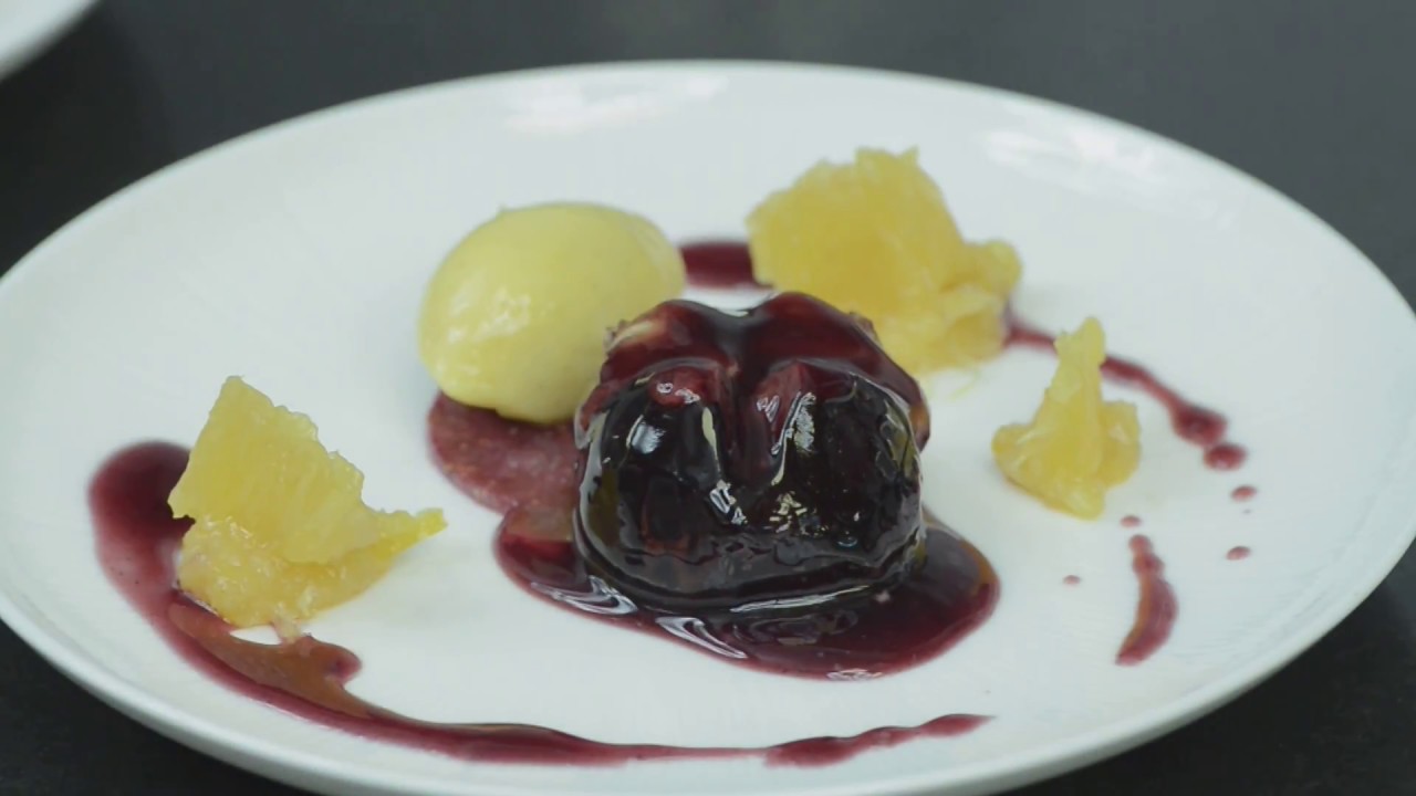 COOKED FIGUE IN MULLED WINE AND ORANGE SORBET