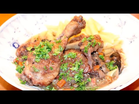 An easy recipe of the French dish “Coq au Vin”, made with chicken and an intense sauce! We cook it all in the same pan and serve with delicious al denté pasta!