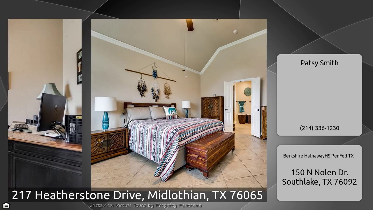 The Virtual Tour for the property at 217 Heatherstone Drive, Midlothian, TX 76065 listed for $349,500: Other homes for sale by Patsy Smith of Berkshire HathawayHS PenFed TX: Immaculate 1 story home with 3 Car Garage located in the Lawson Farms. Open Kitchen to living area with corner fireplace. Extra Large Breakfast dining area. Formal dining flexible area with french doors. Kitchen features granite counter tops with pendent lighting, Stainless appliances, walk in pantry and Pot filler. The 4th bedroom is being used as a study. Large Master suite, two closet spaces, bathroom with separate …