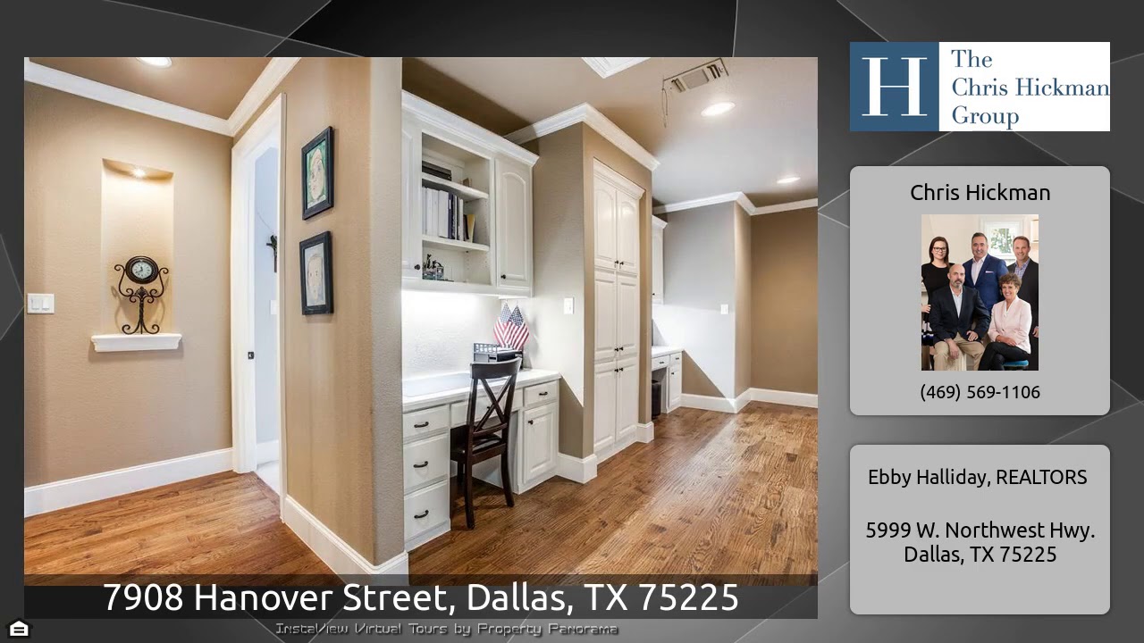 The Virtual Tour for the property at 7908 Hanover Street, Dallas, TX 75225 listed for $1,799,000: Other homes for sale by Chris Hickman of Ebby Halliday, REALTORS: Fantastic custom in HPISD. This 4 bed, 4.5 bath, 2 car garage home with pool & spa offers great space with an open floor plan. The two-story entry with grand staircase is flanked by the formal living with fireplace and formal dining with walls of windows. Handsome study with French doors and built-ins. Large family room with wood-burning fireplace opens to covered patio, pool, spa, outdoor fireplace, and built-in grill. Amazing …