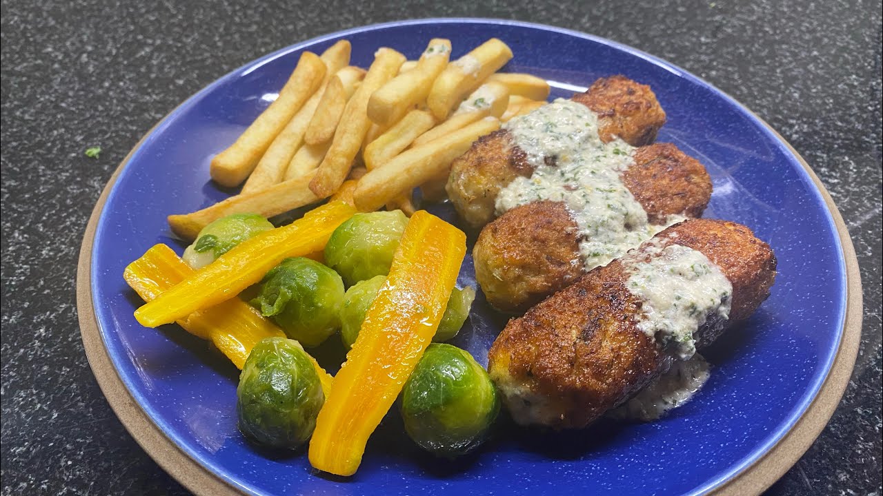 Chicken rissoles in parsley sauce with French fries and veg