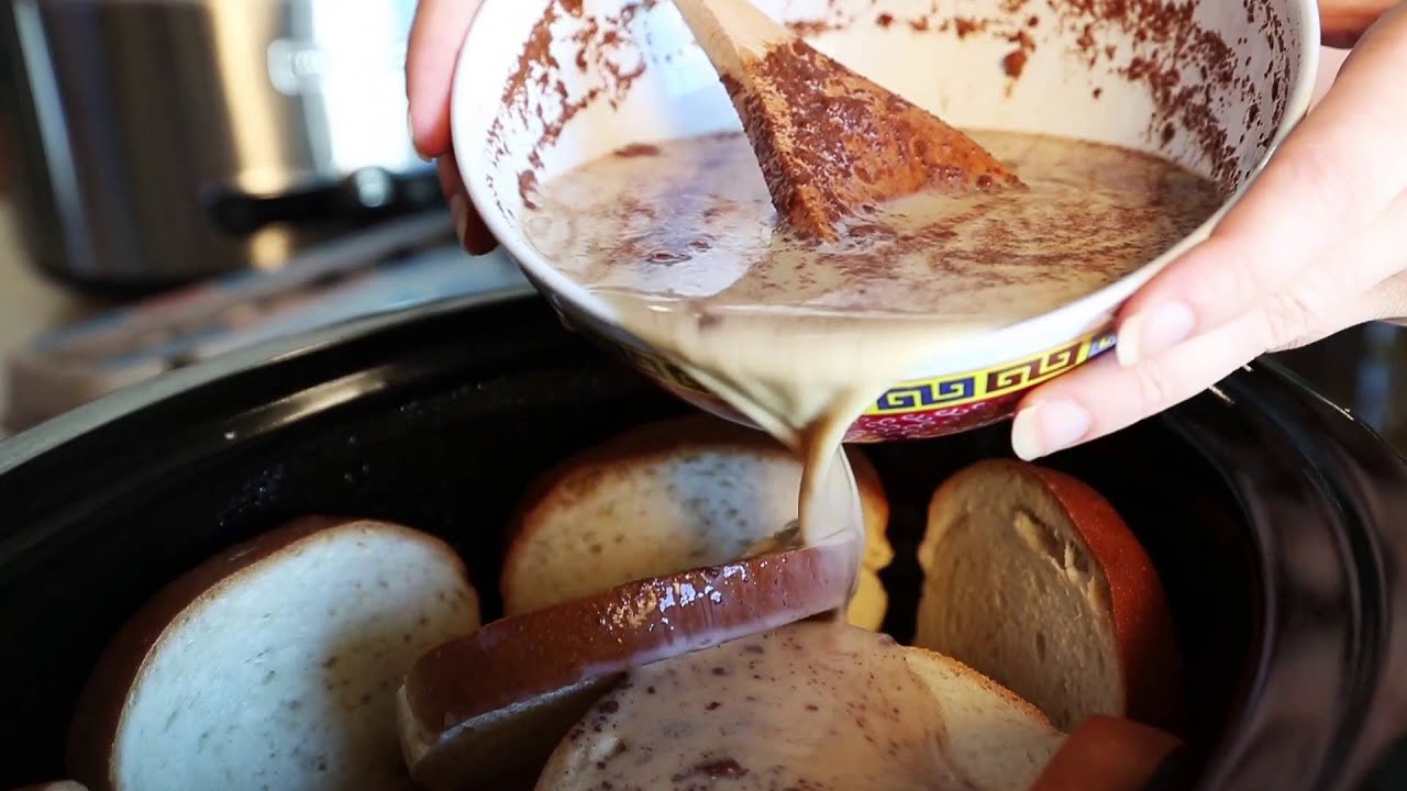 Slice or cube bread and leave out overnight to let it dry out a bit. Line your slow cooker with foil that’s been folded over two or three times and spray with nonstick spray. Whisk together eggs, milk, cinnamon, vanilla and salt. Layer slices of bread along the bottom and let it come up the edges a bit. Pour a bit of mixture over bread to cover. Add more layers of bread. Add more of the mixture and continue, ending with the mixture. Cover with a clean dishtowel and the lid and cook on high for 2 hours.