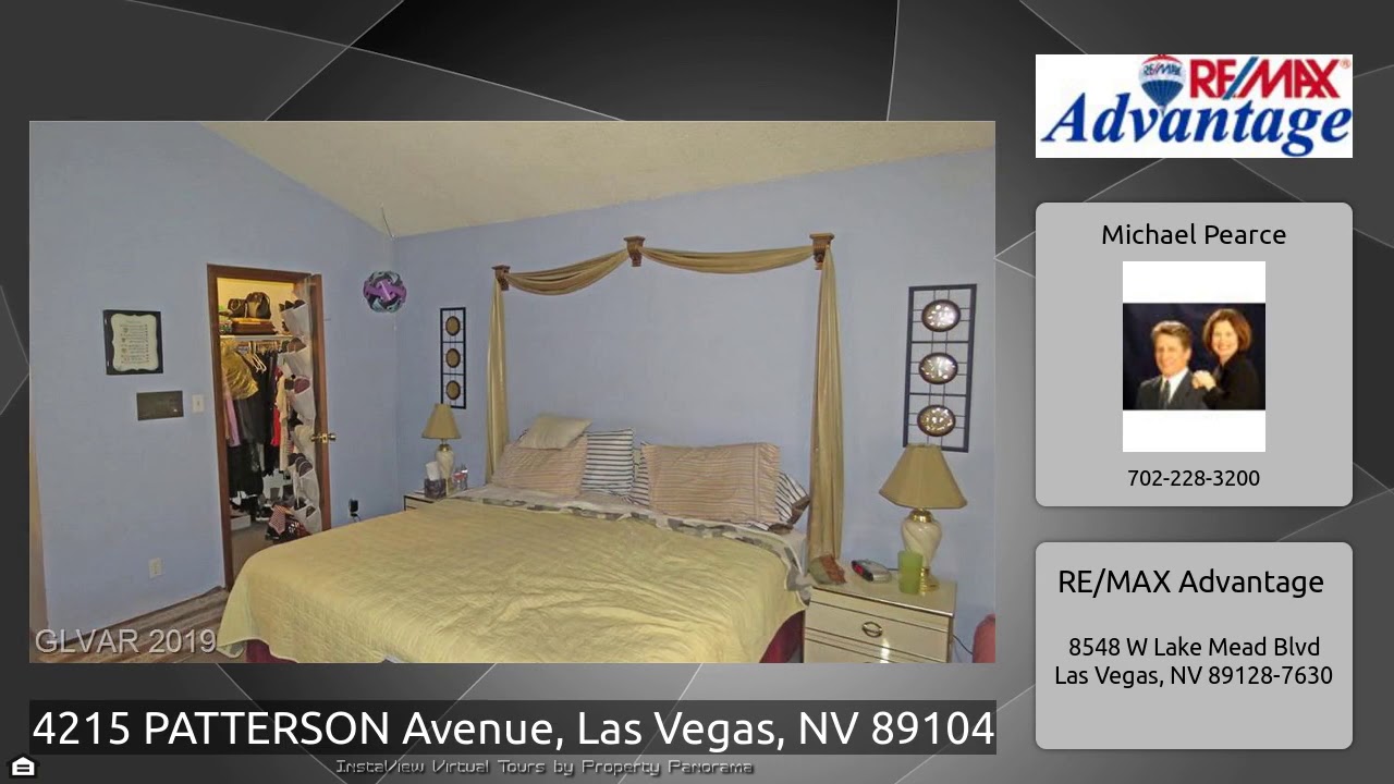 The Virtual Tour for the property at 4215 PATTERSON Avenue, Las Vegas, NV 89104 listed for $260,000: Other homes for sale by Michael Pearce of RE/MAX Advantage: Great floor plan! A/C is only 1.5 years old. All new dual pane windows installed 2016. Stainless steel refrigerator & dishwasher installed in 2017. Extra insulation in attic. New pool pump installed in 2018. Separate family room with wood burning fireplace. Dining room features french doors that lead to covered patio and pool area. Kitchen features newer, oak cabinets. Beautiful pool is 3x4x3 in depth.