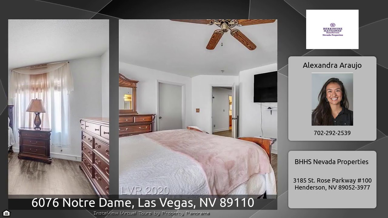 The Virtual Tour for the property at 6076 Notre Dame, Las Vegas, NV 89110 listed for $285,000: Other homes for sale by Alexandra Araujo of BHHS Nevada Properties: Great 2 story home at the end of a cul de sac with NO HOA! Kitchen w/island has granite counter tops and stainless steel sink. Solar screens through out home. 2nd bedroom connects to hall bathroom. Fireplace in family room. French doors in dining room that lead to Covered patio. Dining room has ceiling fan. Security bars on windows throughout home. Backyard includes pavers, planters and a shed.