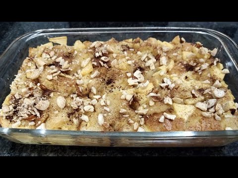 Cut the bread into cubes or tear with hands. Put the bread cubes in baking dish. Peel and cut an apple, add apple over the bread. In a bowl, add eggs, milk, sugar and vanilla essence. Whisk all the ingredients, pour the mixture over the bread evenly. Covered and refrigerate overnight.