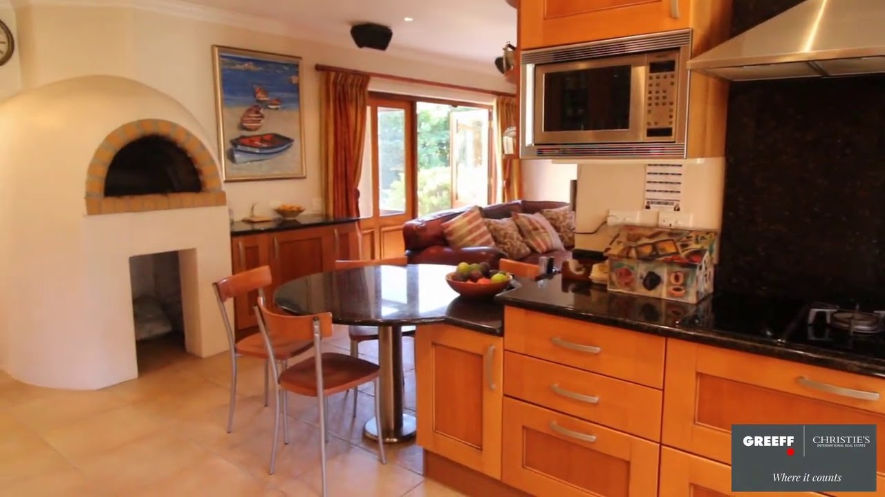 There are ample reception rooms, including a 12-seater dining room with a wine cellar with doors open to a tranquil courtyard. The TV room is open plan, with its own cosy fireplace adjoining the well-equipped kitchen with a pizza oven and walk-in pantry. The separate sitting room with French doors opens to the garden and an undercover patio with built-in braai is perfect for entertaining.