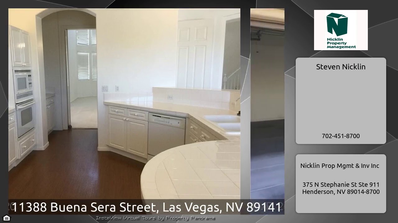 The Virtual Tour for the property at 11388 Buena Sera Street, Las Vegas, NV 89141 listed for $2,195: Other homes for sale by Steven Nicklin of Nicklin Prop Mgmt & Inv Inc: Magnificent 2 Story Home In Gated Community With 4 Beds, 4 Baths Plus Den & 3-Car Garage. Nice Size Bedrooms With Walk-In Closets. Master Bathroom Offers Double Sinks And Separate Bathtub And Shower. Kitchen Features White Tile Counters & Cupboards, White Appliances With Built-In Oven. Separate Dining Area , Den With Double French Doors, Separate Living & Family Room. Desert Landscaping W/Covered Patio In Backyard. Tenants To …