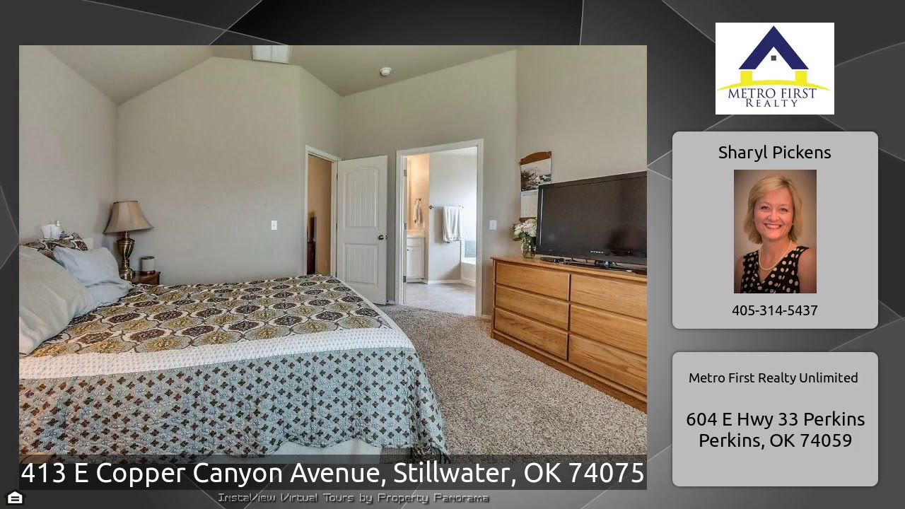 The Virtual Tour for the property at 413 E Copper Canyon Avenue, Stillwater, OK 74075 listed for $236,000: Other homes for sale by Sharyl Pickens of Metro First Realty Unlimited: BEAUTIFUL HOME IN THE CANYONS! Quiet area in north Stillwater. This 3 bed/2 bath 2,021 square foot charmer will make you glad to come home! Office with French doors near entry. Perfect for working from home. Formal living or dining area – can be exercise room/game room/study room. Open living/kitchen/dining. PANTRY. Large island in kitchen with counter space. QUARTZ COUNTERTOPS IN KITCHEN! White cabinetry. So much room …