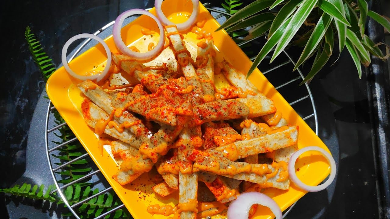 FRENCH FRIES RECIPE with CHEESY SAUCE–Crispy Taro Root French Fries/গুটি কচুৰ মচমচীয়া French Fries