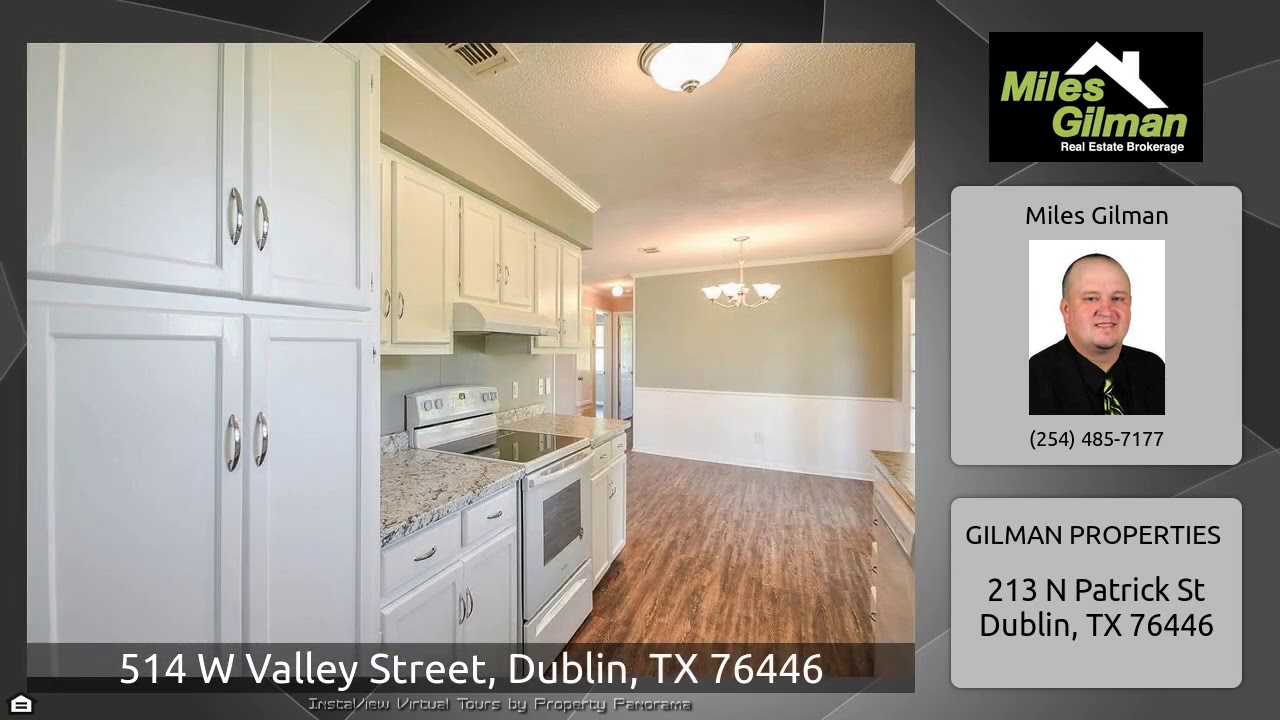 The Virtual Tour for the property at 514 W Valley Street, Dublin, TX 76446 listed for $150,000: Other homes for sale by Miles Gilman of GILMAN PROPERTIES: YES! This 3 bed, 2 bath charmer has just been remodeled! Large, open to dining living room shines natural light from the front of the house to the back. Dining room looks out into backyard through glass french doors and connects to all new galley style kitchen. New appliances sprinkled throughout it, ample cabinet storage, beautiful carpentry throughout kitchen which leads to walk through utility, into a recently added one car garage with …