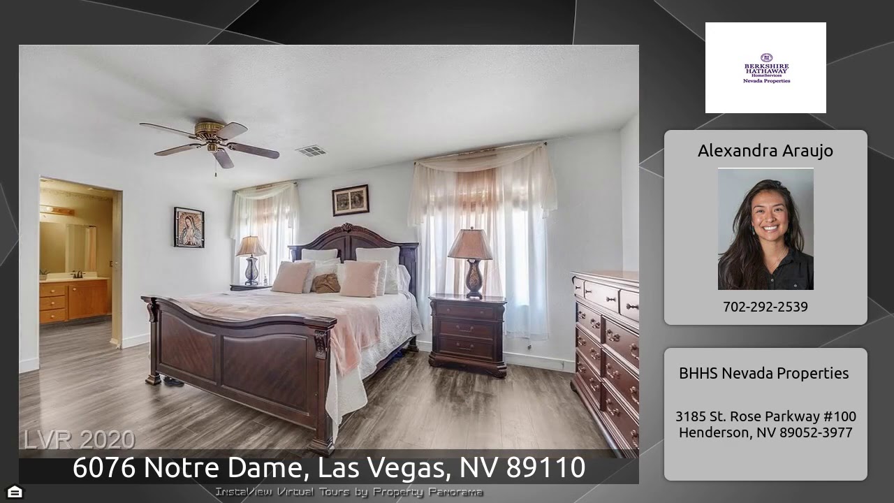 The Virtual Tour for the property at 6076 Notre Dame, Las Vegas, NV 89110 listed for $285,000: Other homes for sale by Alexandra Araujo of BHHS Nevada Properties: Great 2 story home at the end of a cul de sac with NO HOA! Kitchen w/island has granite counter tops and stainless steel sink. Solar screens through out home. 2nd bedroom connects to hall bathroom. Fireplace in family room. French doors in dining room that lead to Covered patio. Dining room has ceiling fan. Security bars on windows throughout home. Backyard includes pavers, planters and a shed.