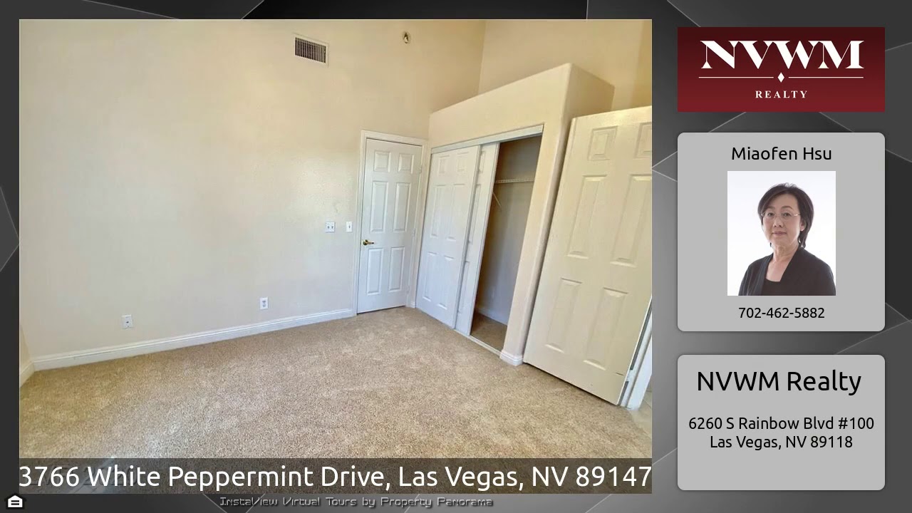 The Virtual Tour for the property at 3766 White Peppermint Drive, Las Vegas, NV 89147 listed for $308,000: Other homes for sale by Miaofen Hsu of NVWM Realty: Beautiful single story home located in SW area. Living room presents itself with a vaulted ceiling, fireplace, tile floors and open area. The living room's french doors through to the backyard. Kitchen with dining nook. The master Bedroom with double door and french door to backyard. Master bath with walk-in-closet and dual sinks. New carpet in bedrooms. Very convenient location mins to supermarket stores, parks, and lots more. This home …