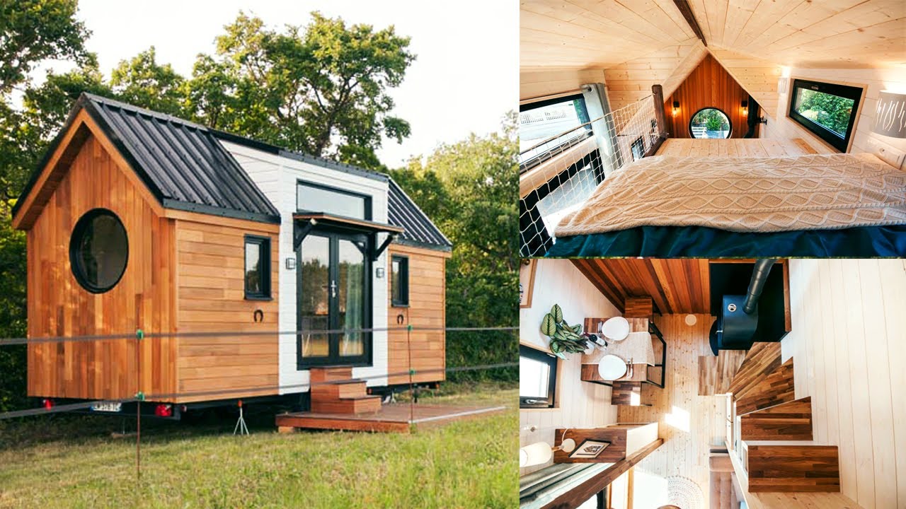 Inside the 20-foot tiny house are box beam ceilings, spruce flooring, and a mixture of stained, natural, and white painted woods.