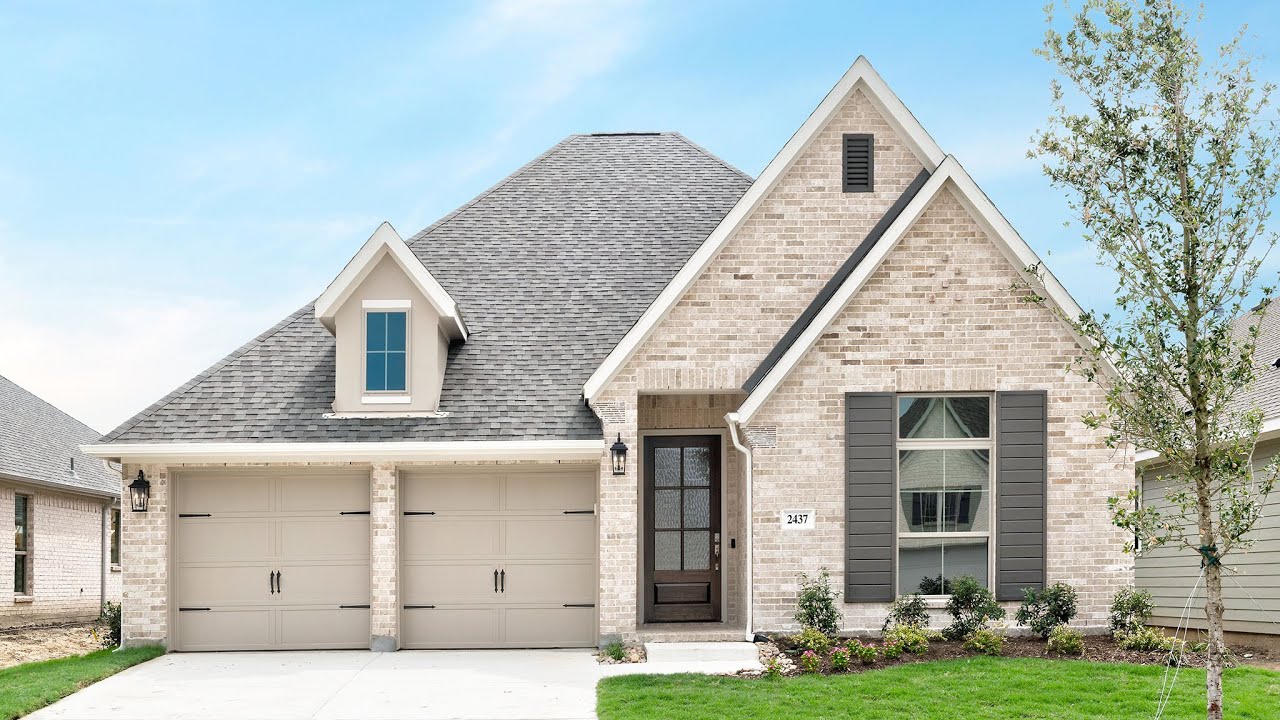 Pecan Square is reminiscent of a classic Texas town full of life, town spirit and new ways to live. This 2352 sq. ft. plan offers four bedrooms and three full bathrooms. Entry with 12-foot ceiling leads to open family room, dining area and kitchen. Abundant natural light throughout. Wood-look tile featured in entry, kitchen, dining area and family room. Kitchen offers quartz countertops, corner walk-in pantry and generous island with built-in seating space. Dining area flows into family room with wood-mantle fireplace and wall of windows. Primary suite includes bedroom with wall of windows. Double doors lead to primary bath with dual vanities, corner garden tub, separate glass-enclosed shower and walk-in closet. Library with French doors set at back entrance. Secondary bedrooms, a full bath plus a guest suite complete this open one-story design. Extended covered backyard patio. Two-car garage. #perryhomes