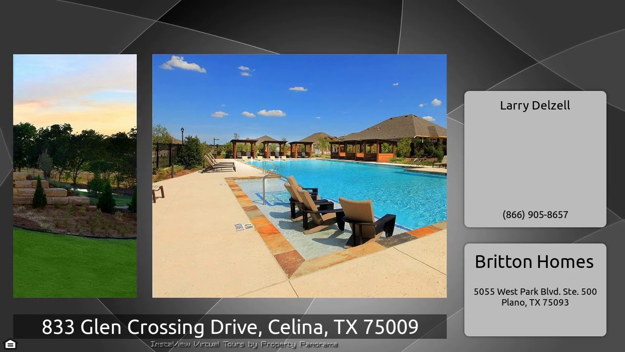 The Virtual Tour for the property at 833 Glen Crossing Drive, Celina, TX 75009 listed for $424,900: Other homes for sale by Larry Delzell of Britton Homes: PERRY HOMES NEW CONSTRUCTION! Mahogany front door. Library with French doors and dining room adjacent to entry. Two-story entry and family room with a wall of windows. Kitchen opens to morning area. Master suite with 11-foot ceiling. Garden tub, separate glass-enclosed shower, dual sinks and two walk-in closets in the master bath. Second bedroom downstairs. Upstairs game room. Covered backyard patio. Two-car garage. This home is in the …