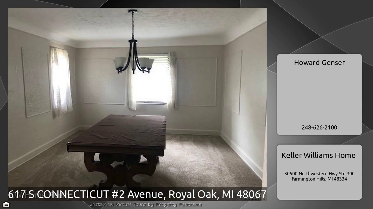 The Virtual Tour for the property at 617 S CONNECTICUT #2 Avenue, Royal Oak, MI 48067 listed for $1,700: Other homes for sale by Howard Genser of Keller Williams Home: Fantastic French Electric Tudor second floor flat for lease. A Stunning Turret entrance opens to the spiral staircase up to this unique unit. Architectural appointments include: A charming Pewabic tile foyer. A stone Fireplace with a limestone mantle and stone hearth. Beamed ceiling and archway in Dining Room. The dining room and Living room have Beautiful Oak Peg and Plank period flooring. The Kitchen has ss appliances and …