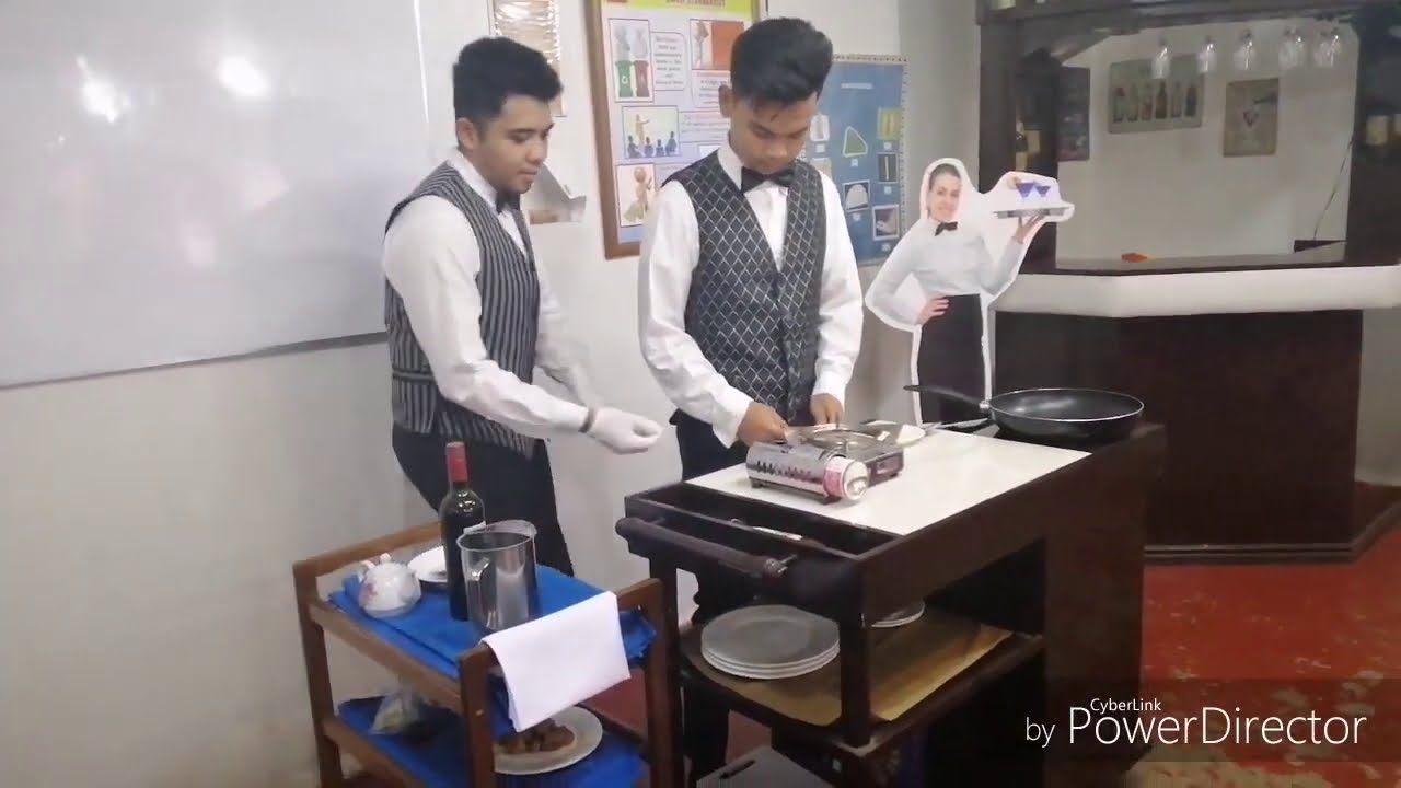 It is a very elaborate type of service. It requires special skills on the part of the waiter. The food is brought to the dining room in a Gueridon. The food is partially cooked in the kitchen, then the preparation is completed in the dining room at the side table of the guest, usually with some showmanship by flaming the food.
