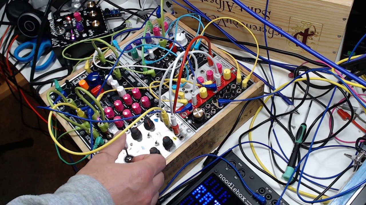 Jam using my mini synth.. mini synth is made out of a French Wine box.. Has a Fonitronik 555 Vco (using pulse out) befaco even vco using the even out… both into one side of the dual xvca from frequency Central, using a dual system X envelope X splitting the audio into two filters the state 700 mk2 using the highpass output and the raging bull 3.0 which is moog style filter.. mixed in the ST modular MIA this allows me to (by hand) mix the two filters for optimum enjoyment…