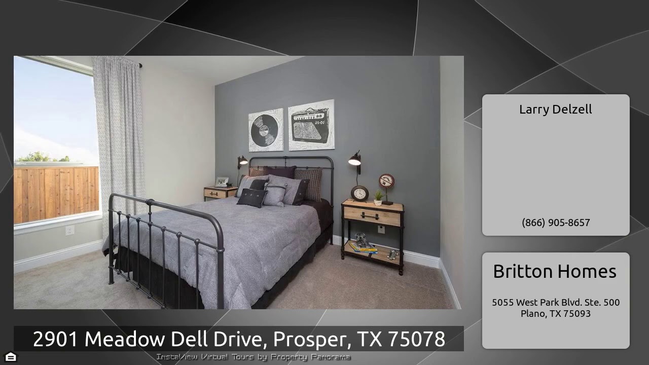 The Virtual Tour for the property at 2901 Meadow Dell Drive, Prosper, TX 75078 listed for $724,900: Other homes for sale by Larry Delzell of Britton Homes: BRITTON HOMES NEW CONSTRUCTION FORMER MODEL! Home office with French doors set at entry. Hardwood floors throughout. Media room with French doors off extended entry. Formal dining room opens to family room with sliding glass doors and corner fireplace. Kitchen hosts generous island with built-in seating space, White Shaker cabinets and gas cooking. Adjoining morning area features wall of windows. Primary bedroom features wall of windows. …
