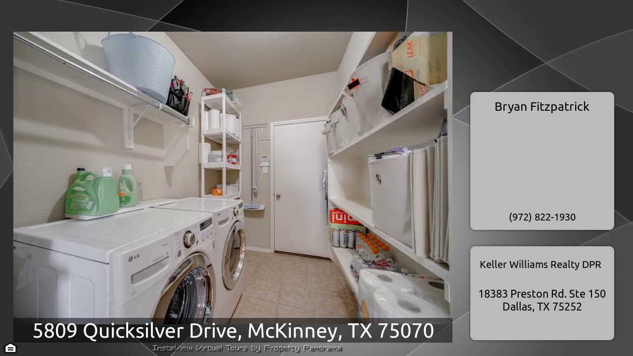 The Virtual Tour for the property at 5809 Quicksilver Drive, McKinney, TX 75070 listed for $350,000: Other homes for sale by Bryan Fitzpatrick of Keller Williams Realty DPR: Gorgeous 4 bedroom, 2.5 bath home in Frisco ISD! Island kitchen boasts granite, tile backsplash, breakfast bar and eat in nook overlooking the backyard. Spacious family with gas fireplace. Private study with french doors. Beautiful wood flooring in entry, study and dining room. Huge master suite upstairs with dual sinks, garden tub, separate shower and walk-in closet. Secondary bedrooms and loft, gameroom also upstairs. …