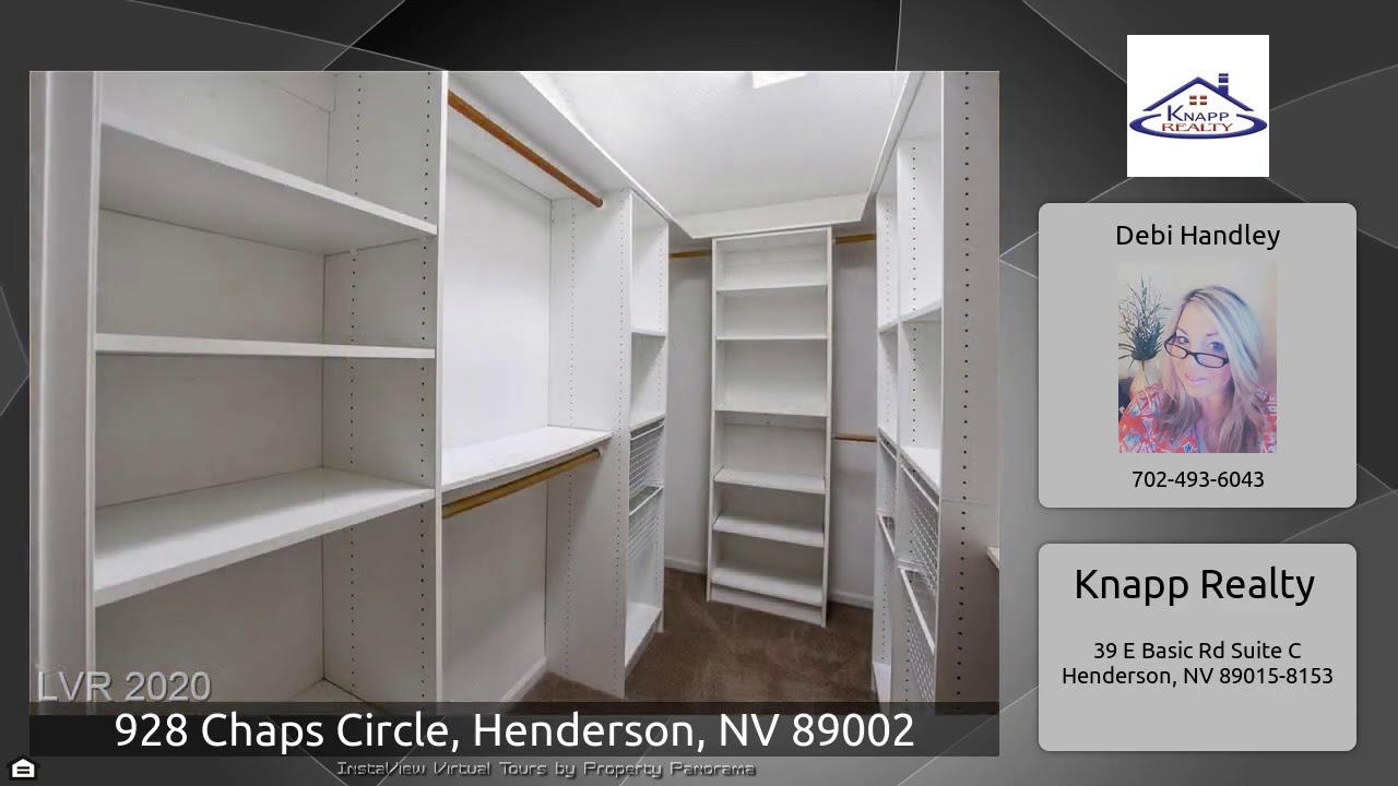 The Virtual Tour for the property at 928 Chaps Circle, Henderson, NV 89002 listed for $375,000: Other homes for sale by Debi Handley of Knapp Realty: Largest Lot in Subdivision*Oversize RV Parking* Covered Patio* Cute Garden/Storage Shed with Sliding Glass Door * Large Great Room with *French door access from Master Bedroom and entrance from Large Open Kitchen/Dining Area w/ Fireplace and Island, Garden Window* Front Formal Dining Living and Den/Office or 4th Bedroom*12,000 + sq ft Lot (over .25 Acre) No HOA Well kept Neighborhood and Mature Landscape.