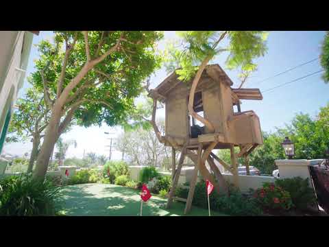 Solid oak flooring, tumbled travertine and arched doorways lend this home its unique character, as does the two-story entry with a winding staircase, a wood-paneled library with a hidden humidor room, a billiards/family room, even a putting green, and treehouse.