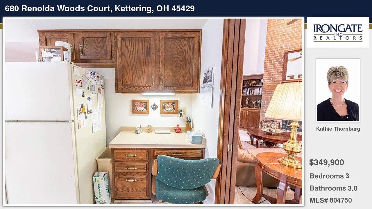 680 Renolda Woods Court Kettering Ohio Homes for Sale | www.irongaterealtors.com | Kathie Thornburg with Irongate Inc., Realtors | See full property details at | Lincoln Park Gem! Exceptional 3 bedroom 3 bath condo ideally located within blocks of Lincoln Park and Fraze Pavilion. Beautiful, very private setting. Enjoy wooded views from the wall of windows in the great room which also features a 2 story brick wood burning fireplace and built in bookcases. Formal dining room. Gourmet kitchen with large pantry and eat in breakfast room with french doors opening to a charming 3 season sun room overlooking a very private side yard. 1st floor master suite with walk in closet. Master bath features a whirlpool tub and separate shower. 1st floor den or 3rd bedroom with walk in closet and full bath. Open staircase to 2nd floor loft area – 2nd bedroom and 3rd full bath. Also, large walk in unfinished attic (ready to finish). Private rear deck off of great room. First floor laundry. Oversized 2 car garage. New carpet Oct. 2019. Top quality construction in a beautiful private setting!