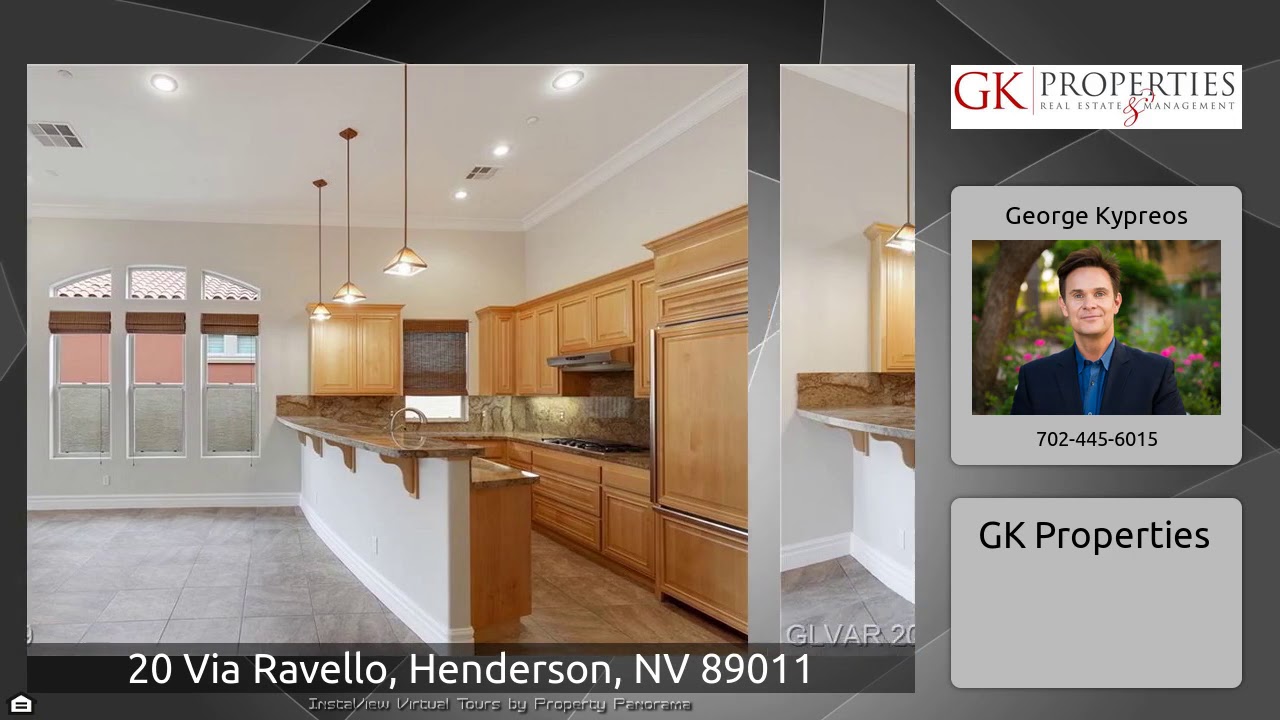 The Virtual Tour for the property at 20 Via Ravello, Henderson, NV 89011 listed for $569,900: Other homes for sale by George Kypreos of GK Properties: Impeccable 1-STORY 3BDRs, 3.5BTHs & Den in prestigious Lake Las Vegas! Amazing curb appeal w/unique façade & courtyard. Bright Family Rm w/cozy fireplace & joined Dining area. Expensive ambiance w/French doors, crown molding, gorgeous tile flooring & fixtures. Kitchen w/granite cnts & backsplash & high-end SS appls. All BDRs w/private luxurious BTHs. Backyard oasis w/sparkling POOL, firepit, builtin BBQ, covered patio, golf course & mountain view