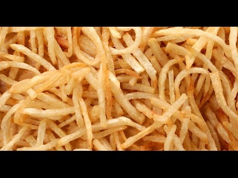 Peel potatoes and julienne the peeled potatoes into shoestring french fries. They should be 1/4-inch by 1/4-inch thick and about 4 inches to 6 inches long.