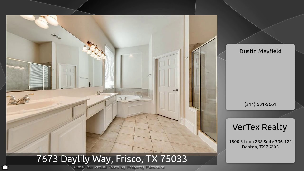 The Virtual Tour for the property at 7673 Daylily Way, Frisco, TX 75033 listed for $2,550: Other homes for sale by Dustin Mayfield of VerTex Realty: Gorgeous Drees home in highly sought after Frisco ISD. Recent updates include a new fence, new upstairs carpet and the entire interior was re-painted. Floorplan features a study with french doors and built-ins, two-story formal living, formal dining, full bath, large kitchen with an island open to the family room with built-ins and wood floors, and a large master suite with dual sinks, separate shower and tub, and a huge walk-in closet down, …
