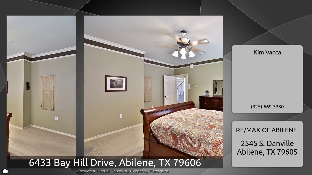 The Virtual Tour for the property at 6433 Bay Hill Drive, Abilene, TX 79606 listed for $380,000: Other homes for sale by Kim Vacca of RE/MAX OF ABILENE: Grand entry with balcony staircase overlooking the family room with 21' ceiling, french doors, wainscot accents, & a mosaic tile masonry fireplace with gas logs. Formal dining and sitting rooms freshly painted. Granite counters, an island, breakfast bar and beautiful oak floors invite you to the kitchen! Stainless appliances and custom cabinetry. Full bath with shower downstairs. Second story offers two spacious bedrooms, full bath, & large …
