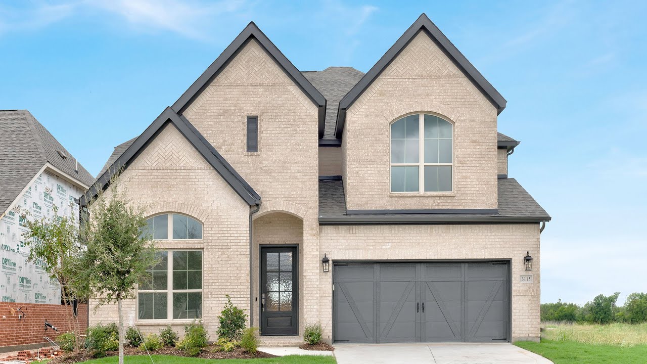 The tranquil surroundings of Mustang Lakes provide the perfect setting for your new Dallas home, whether it is being built from the ground up or is ready for move-in. This 2999 sq. ft. plan offers four bedrooms, three full bathrooms and one half bathroom. Home office with French doors set at two-story entry. Wood-look tile featured in library, kitchen, dining area and family room. Open kitchen hosts inviting island with built-in seating space, quartz countertops and decorative subway-tile backsplash. Two-story dining area opens to two-story family room with cast stone fireplace and wall of windows. First-floor primary suite includes bedroom with wall of windows. Dual vanities, garden tub, separate glass-enclosed shower and two walk-in closets in primary bath. A guest suite with full bath is downstairs. Two secondary bedrooms, a game room and media room with French doors are upstairs. All bedrooms include walk-in closets. Covered backyard patio. Mud room off three-car garage. #perryhomes
