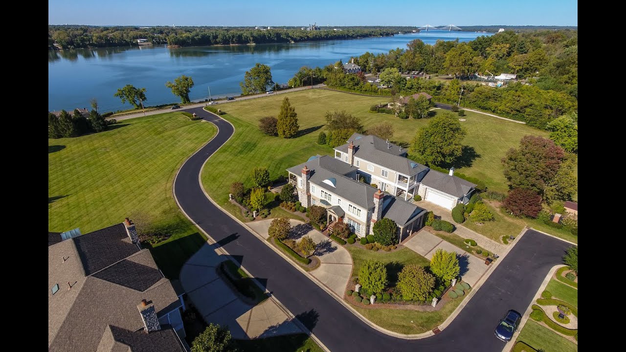 Waterglen Estates consist of only nine homes sharing a ten acre common great lawn, conveniently located off River Road with incredible views of the Ohio River. This home offers architectural details and custom finishes throughout. Including an elevator. The circular driveway welcomes you to the custom front door. Step inside to the exceptional foyer with gorgeous marble flooring. To the left is the walnut paneled library/formal living room with built-in bookcases and fireplace. To the right is the formal dining room with a custom made glass art ceiling light made by Louisville Glass Works. Continue into the large living room with custom stone fireplace and French doors leading to a covered porch with incredible views of the Ohio River. Sit on the covered porch and enjoy the view and listen to the waterfall in the koi pond. The living room is open to the gourmet kitchen with GE Commercial Monogram appliances (two dishwashers) and a 75 bottle wine cooler, bar with a sitting area that can also be used as an eat-in area. Whichever you choose, you will love the view. A gorgeous half bath, large pantry and laundry room complete the main floor. Upstairs is the large primary suite with amazing views of the river, private terrace, spacious bath, and custom his and her walk in closets. The second bedroom offers a wet bar with mini fridge and private bath. The third bedroom is spacious and also has a private bath. There is additional storage on this floor with a custom litter box cabinet, and a tucked away area used as a gift wrapping station and sewing area. The lower level has a large family room, gym and full bath and lots of storage space. Many upgrades and custom finishes to mention. Be sure to see the owner’s list of all improvements in the document tab.