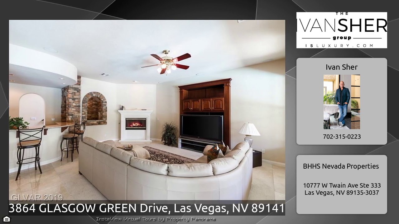 The Virtual Tour for the property at 3864 GLASGOW GREEN Drive, Las Vegas, NV 89141 listed for $1,325,000: Other homes for sale by Ivan Sher of BHHS Nevada Properties: Impressive semi-custom home. Attn to detail & quality finishes. High ceilings, nautural light, dramatic staircase, pristine travertine floors & shutters. All bedrooms ensuite. Chef's kitchen w/ garden window open to large family rm w/entertaining wet-bar/wine cellar. French Doors to resort backyard w/BI BBQ, pool, spa. Serene crtyrd w/fireplace. Lrg corner lot w/grass side yard. Wonderful Casita for guests or nanny's quarters. …