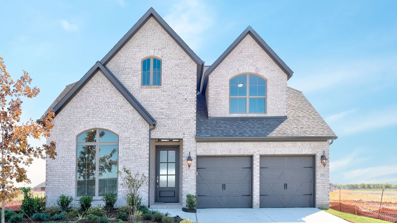 Cambridge Crossing is the newest Perry Homes community located in Celina. This master-planned community will be just west of Dallas North Tollway. This 2694 sq. ft. plan offers four bedrooms and three full bathrooms. Home office with French doors and 11-foot ceiling set at two-story entry. Open kitchen features deep walk-in pantry and generous island with built-in seating space. Dining area opens to two-story family room with wall of windows and wood mantel fireplace. First-floor primary suite includes bedroom with 10-foot tray ceiling. Double doors lead to primary bath with dual vanity, garden tub, separate glass-enclosed shower and large walk-in closet. An additional bedroom is downstairs. Two secondary bedrooms and game room with 10-foot tray ceiling are upstairs. Covered backyard patio. Mud room off two-car garage. #perryhomes