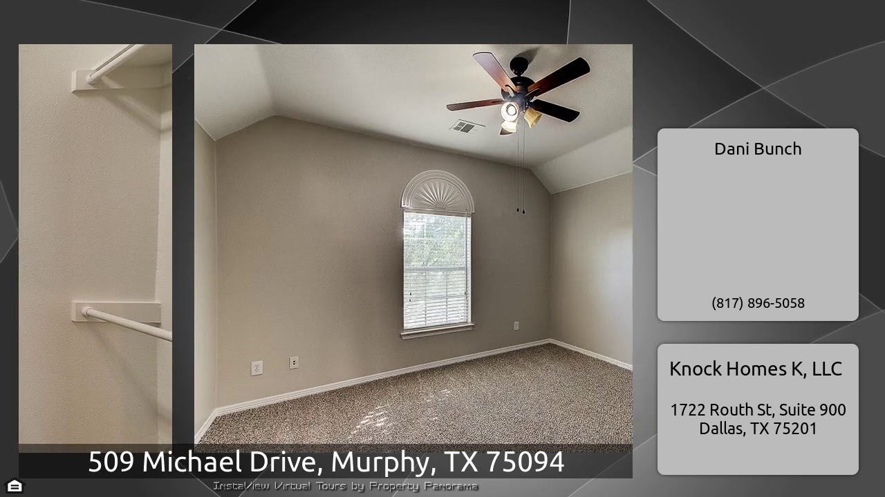 The Virtual Tour for the property at 509 Michael Drive, Murphy, TX 75094 listed for $370,000: Other homes for sale by Dani Bunch of Knock Homes K, LLC: A soaring two story foyer welcomes you into this traditional home that is ready for you with a freshly painted interior and brand new carpeting! Home features a floor plan that is perfect for entertaining and offers space for everyone including a formal dining room with french doors and wainscoting, private den or office, spacious chef's kitchen, fireside family room, and upstairs bonus room for even more living space. Expansive master …