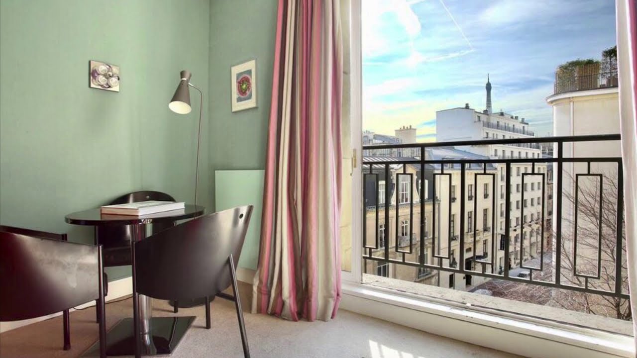 Offering a nice living room and a bedroom, well decorated in a vintage style and with views of the Eiffel Tower in the distance.