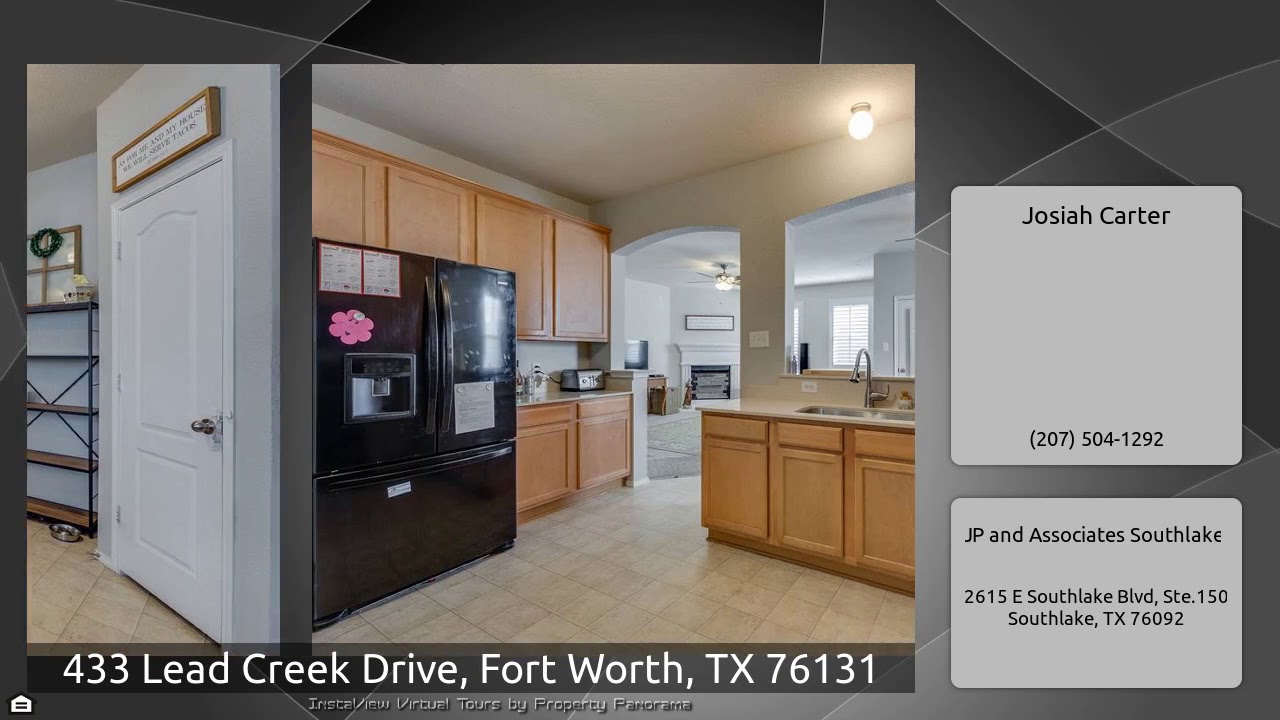 The Virtual Tour for the property at 433 Lead Creek Drive, Fort Worth, TX 76131 listed for $249,999: Other homes for sale by Josiah Carter of JP and Associates Southlake: Very large beautiful home with easy access to Presidio and Alliance Town Center for all your shopping needs. This home has 4 BRs, 3 and half bath, study with French doors, formal dining room, huge game room, and amazing arched doorways. Family room has plantations shutters, and a decorative wood burning fireplace. Kitchen features granite countertops, breakfast bar, and plenty of storage. Master suite has bay window, dual …