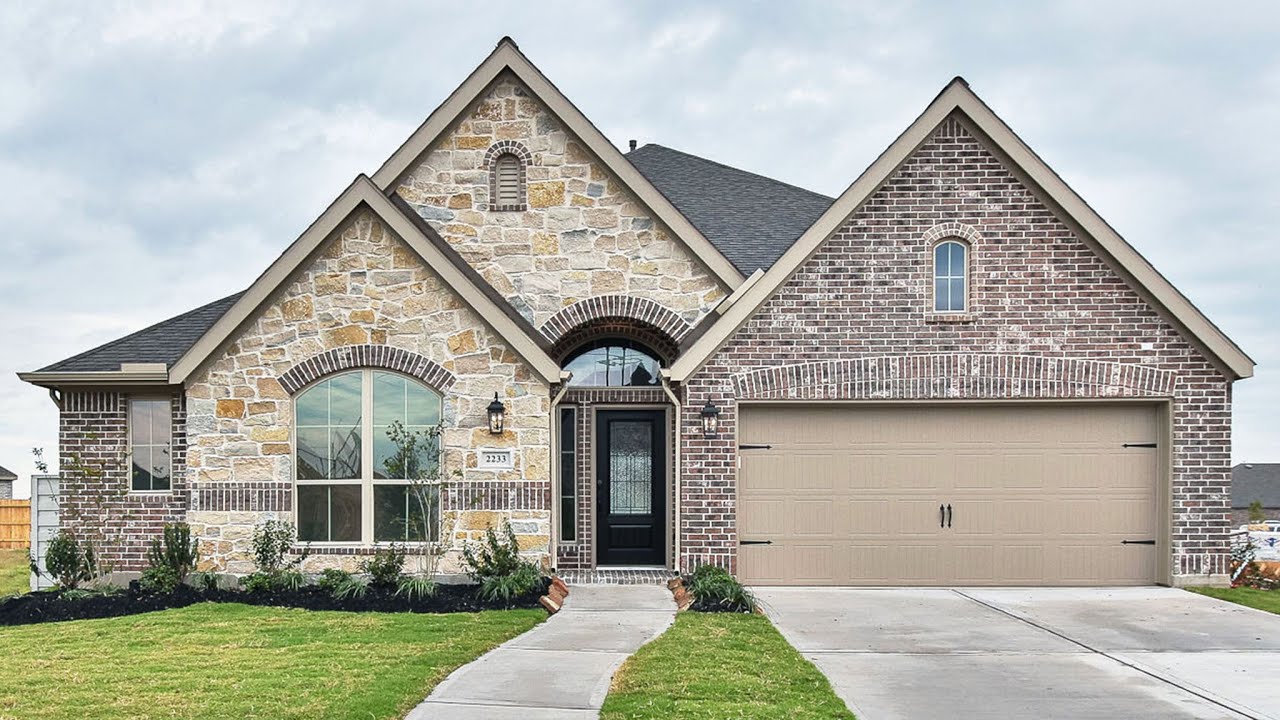 Pomona is a master-planned community of new single family homes for sale in Manvel, TX. This 2493 sq. ft. plan offers four bedrooms and three full bathrooms. Entry welcomes with 12-foot ceiling. Game room with French doors and 12-foot ceiling off extended entry. Kitchen and dining area open to spacious family room with wall of windows. Kitchen hosts inviting island with built-in seating space. Primary suite includes bedroom with 12-foot ceiling. Double doors lead to primary bath with dual vanities, garden tub, separate glass-enclosed shower and two walk-in closets. Abundant closet space and natural light throughout. Extended covered backyard patio. Mud room off three-car garage. #perryhomes