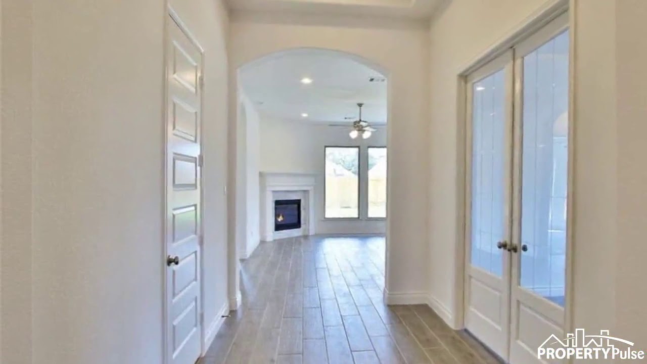 New Construction Home by Perry. Mahogany front door welcomes. Library with French doors and wood-look ceramic tile floor set at entry with 12-foot ceiling. Game room with French doors off extended entry. Open family room with wood-look ceramic tile floor features wall of windows and wood mantel fireplace. Kitchen offers walk-in pantry and large island with built-in seating space. Open dining area adjoins kitchen. Spacious master suite. Double doors lead to master bath with dual vanities, garden tub, separate glass-enclosed shower and oversized walk-in closet. Secondary bedroom suite. Abundant closet space and natural light throughout. Extended covered backyard patio. Two-car garage with 16-foot wide overhead door.